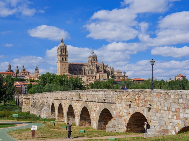 サラマンカの南側を流れるトルメス川には、ローマ帝国が建設した重厚な橋が架かっています。19世紀までは川に架かる唯一の橋でした。建設から2000年経った現在も、歩行者用の橋として使われています。「すべての道はローマに通ず」という名文句がありますが、ここから遠くローマまで約2000kmの街道が通じていたのです。