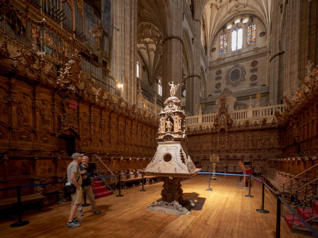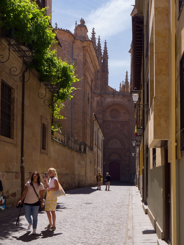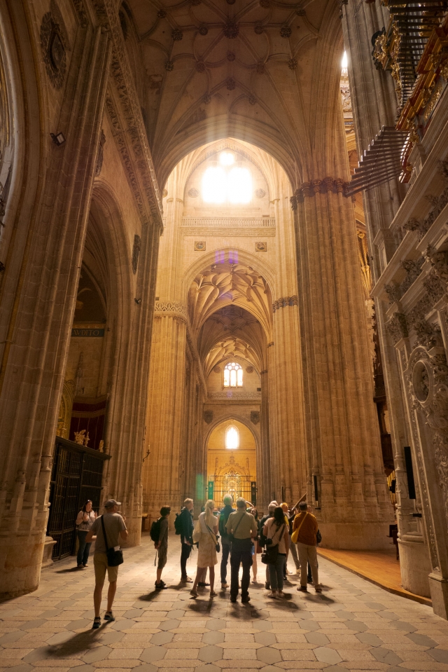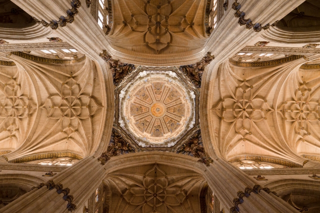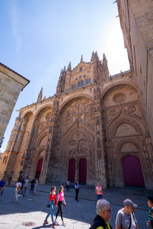 見どころが多いサラマンカでも必見なのが新カテドラル。ゴシックとプラテレスコ様式が混ざった独特な姿をしています。よく見るとファサードが少し傾いています。1755年に起きたポルトガルのリスボン大地震の影響だそうです。