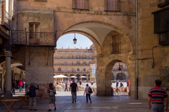 ローマ橋を渡って15分ほど石畳の道を歩くとマヨール広場に到着します。ここはスペインで最も美しいと讃えられる広場。そして町の中心でもあり、市庁舎やツーリストインフォメーションもここに置かれています。サラマンカは、町の端から中心まで短時間で歩けるコンパクトサイズな町なのです。