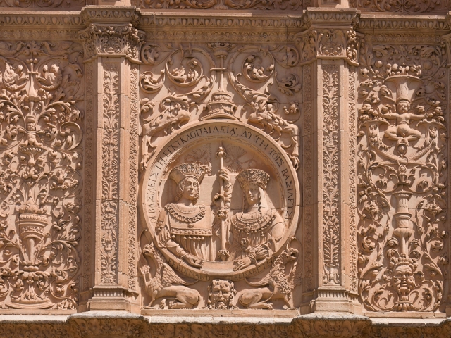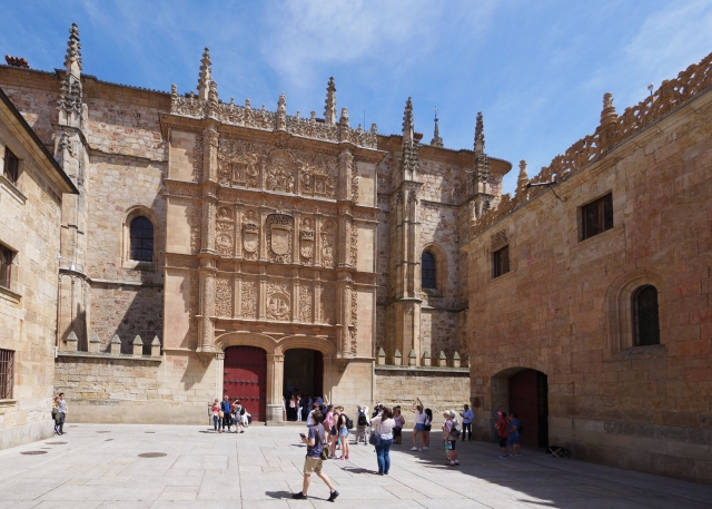 大学本館の正面ファサードはプラテレスコ様式の傑作で、中央にカトリック両王の姿が刻まれています。