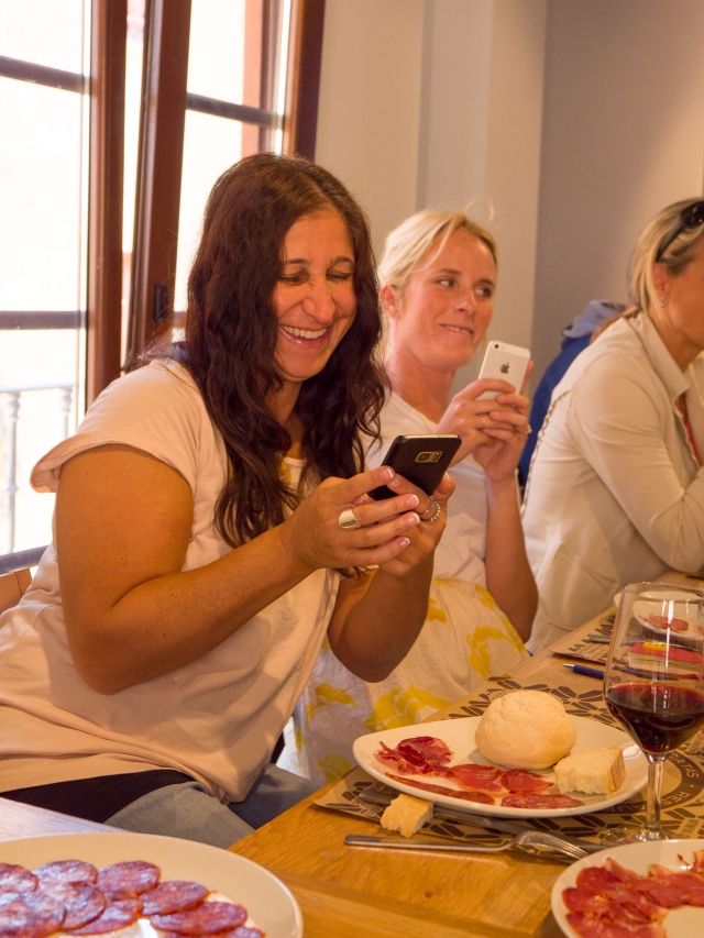 食事が始まる前にスマホで写真撮影するのはお約束。テーブルに座ったお客さんたちがその場でSNSにどんどんアップしているようです。世界一の生ハムレストランで食事中だよ!と書いているのでしょうね。