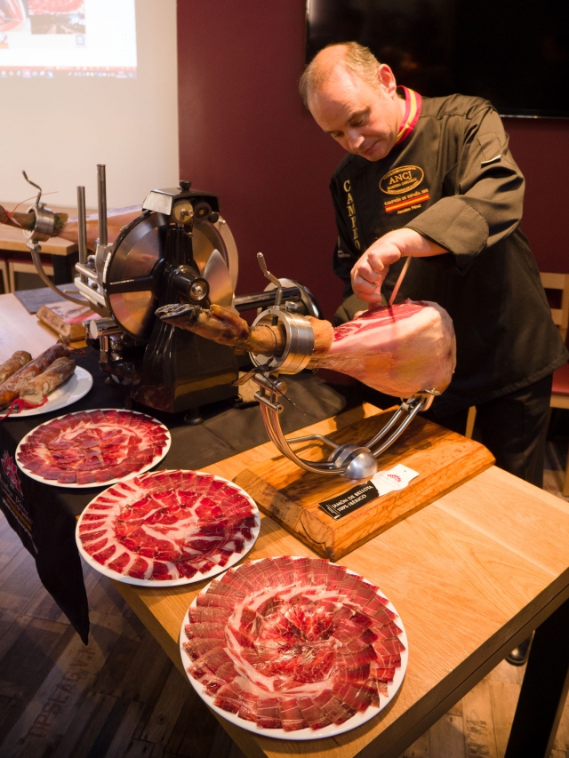生ハムカッター世界チャンピオンのアンセルモ・ペレス氏が、自ら生ハムをスライスしてくださいました。生ハムを切るコンテストがあることをこれまで知りませんでしたが、スペインでは有名なのだそうです。並んでいるのはすべてイベリコ豚の生ハム。さすが、世界チャンピオンの手によってスライスされた生ハムは整然と並べられています。そして美味しそうです。
