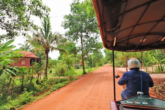 広々とした田んぼのなかに、まっすぐのびる赤土の道。ガタンガタンと揺れながら、軽快に走るトゥクトゥクのドライブはなかなか楽しいもの。シートもフカフカしていますので、お尻が痛くなることもありません。