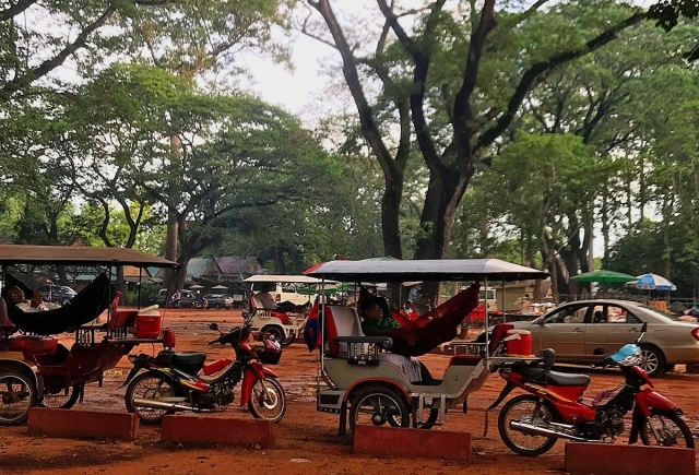 こちら(上の写真)は、アンコールワットのサンライズ鑑賞から帰ってくるお客さんを待つトゥクトゥクと、そのドライバーのみなさんの様子です。カンボジアの人は、トゥクトゥクのハンモックで昼寝(朝寝)をするのが大好きなようです。