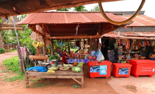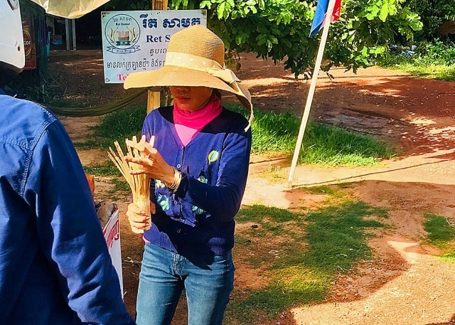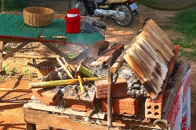 最後に、ベンメリア遺跡からトンレサップ湖への移動中に見つけた竹筒ごはんを紹介します。6号線沿いを走っていると、何やらゆらゆらと煙のたち上がる屋台が並んでいるのに気がついたのですが、それが竹筒ごはんを作って売っている屋台でした。