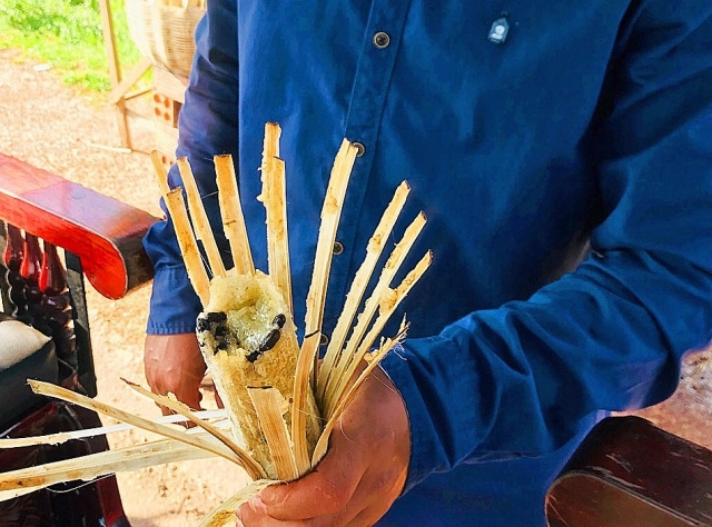 竹筒が焼かれることで、なかのお米が蒸されるわけです。焼きあがったら竹筒を割り、薄皮を裂いて、なかのごはんを食べます。ほんのりと甘いモチモチのごはんは、小腹がすいたときにちょうどよいスナック代わりになります。
