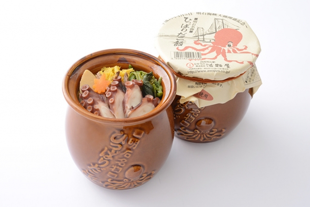 ひっぱりだこ飯は、固くなりなりやすいタコを、 ほどよい弾力を残しつつも軟らかく、食べやすくするため、最良の調味料配合と炊き時間をあみだして作られた駅弁です。ひっぱりだこ飯は、年間500,000食を販売しており、主塔間の距離が世界最長の吊り橋「明石海峡大橋」の開通を記念して発売されました。駅弁の当地・明石はマダコの収穫量日本 一。「見て楽しく、食べておいしい、持ち帰ってさらに嬉しい」をコンセプトに、器から中身まで、食べる前から食べた後まで楽しめる弁当になっています。