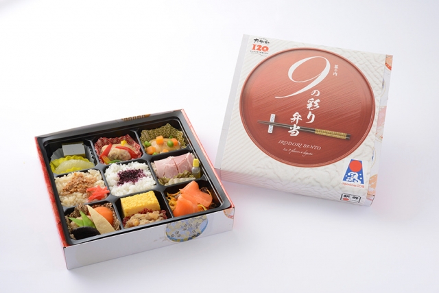 幕の内 9の彩り弁当は、前菜 3種と米飯料理3種、魚料理と肉料理にデザートを付けて、9つに仕切 った折箱に詰め、フランス料理のコースに見立てました。駅弁の原点である「地産地消」の考えにもとづき、フランスで手に入る食材を使って日本風に調理した弁当です。フランスの食文化に合わせて味付けもアレンジ。日本の味を前菜か らデザートまで楽しめます。