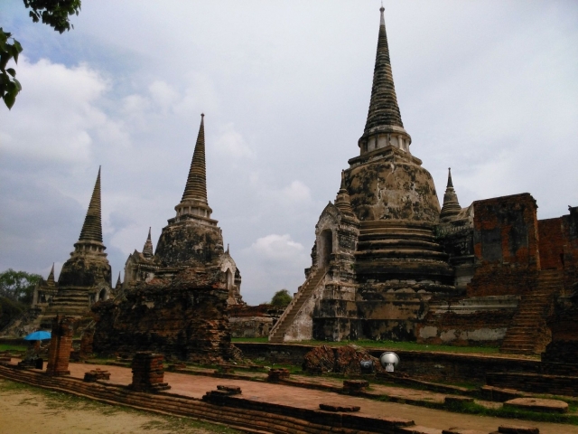 3人のアユタヤ王朝の王が眠る守護寺院。3基のスリランカ様式の仏塔が並ぶ遺跡です。1,500年、16mの高さを誇る黄金に覆われた仏像が建立されましたが、1767年のビルマ侵攻で崩壊し、今では仏塔や柱の遺構だけが残っています。バンコク王朝のワットプラケオ(別名:エメラルド寺院)と同様、王宮の敷地内にあったこの寺院は、格式高く、アユタヤで最も重要な建築物とされていました。夜になると、三つの仏塔がライトアップされ、美しい夜景を見ることが出来ます。