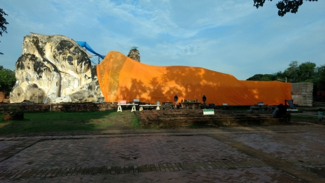 屋外に突如として現れる高さ5m、全長28mの大きな涅槃仏。別名「ワットローカヤスターラーム」とも言われています。釈迦が80歳で入滅する姿が表されており、脚は上下に揃え、微笑みを浮かべ、目が閉じられています。涅槃仏には目を開いているものと、目を閉じているものがあります。目を開いている涅槃仏は、入滅前、最後の説法をしている姿が表現されています。目を開いてる涅槃仏といえば、バンコク市内にある三大寺院の一つ、「ワットポー」がとても有名ですね。また、目を閉じているものは、全てを終え完全に入滅したことを意味しています。ワットロカヤスターは、アユタヤ王朝中頃、ビルマ軍の攻撃により、大部分が崩壊してしまいました。現在ご覧頂けるのは、1956年に復元されるものです。献花台には、金箔が貼られた小さな涅槃物があり、金箔やお花、お線香を売り子さんから購入し、お供え頂くことも出来ます。