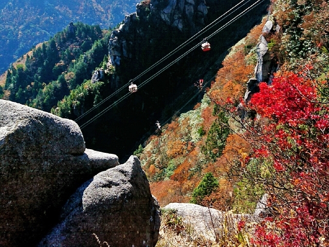 三重県と滋賀県の境にある標高1,212メートルの御在所岳(ございしょだけ)は、標高によって葉の色づく時期が異なり、山全体が徐々に秋色に染まっていきます。山上、中腹、山麓にある湯の山温泉まで、3つのエリアは上から順に段階的に紅葉の見ごろを迎えます。