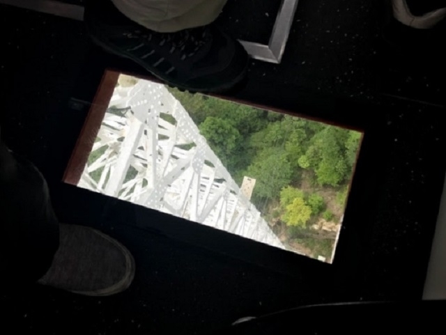 「ルミエール ゴンドラ」は、床面に展望窓があります。展望窓から真下を眺めると、美しくも、その高低差に少しゾクゾクする景観が広がっています。ゴンドラを繋ぐ鉄塔の真下に差し掛かると、床面からは鉄塔一部が覗けます。