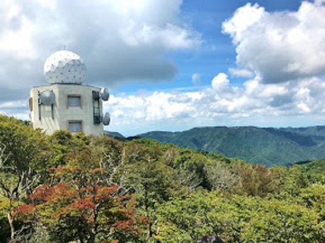 朝陽台広場からは、伊勢湾から伊勢平野にかけて広がる景色が眺められます。また、すぐ近くには雨量レーダーの白い建物も。