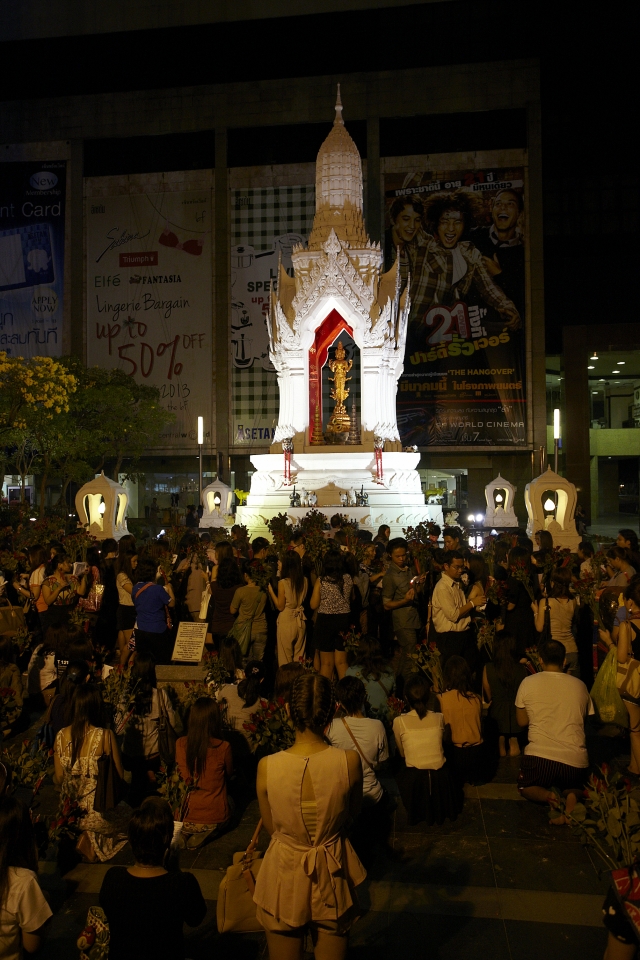 最後に写真映えスポットではないかもしれないけれど、日本にいる友人にはナイショで訪れたいパワースポットを紹介。それはバンコクの中心地にある東南アジア最大級のショッピングセンター「セントラルワールド」の目の前に鎮座するふたつの祠「プラ・トリームールティ」。