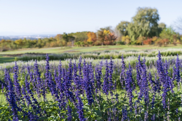 ここ十勝ヒルズは、帯広の市内を見下ろす小高い丘の上にある美しいガーデンです。東京ドームが5つ分という広大な敷地の中に、7つのガーデン、レストラン、カフェ、ショップ、農場などが、自然と調和しながら美しい景観を作り出しています。園内をゆっくりと進んでいくと、最もシンボリックなガーデン、スカイミラーに。ブルーサルビアがきれいな弧を描くその先に、帯広市内が広がっていました。