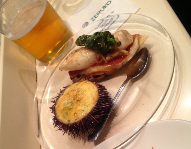 ようやく選んだウニのグラタンは、クリーミーなソースの下から、殻にはりついた黄色いウニの身がコンニチハ^^ イカのピンチョスも、身がやわらかでさっぱりフレッシュ。どれもおいし~い♪ ビールがごくごくススんじゃいました★