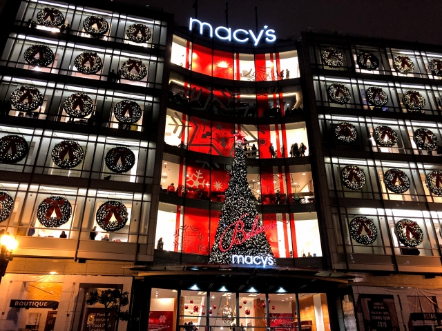 ユニオンスクエアの真正面にあるデパート「メイシーズ(Macy's)」のウインドーディスプレーも冬の風物詩。各ウインドーには、大きなクリスマスリースが飾られ、点灯する光のショーを楽しめます。