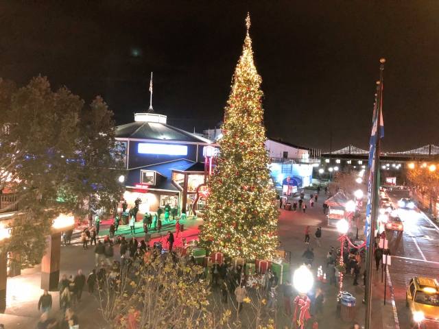 2019年11月26日(火)から点灯が始まるのが、フィッシャーマンズ・ワーフにある「ピア39(Pier 39)」のクリスマスツリー。こちらはピアの入口にあり、約18mの高さとなる巨大ツリーを楽しめます。毎日午後5時午後10時まで、毎正時に行われる点灯ショーも見ものです。