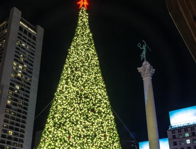 サンフランシスコのクリスマスイルミネーションとして外せないのが、「ユニオンスクエア(Union Square)」でしょう。2019年は、感謝祭の次の日となる11月29日(金)、午後6時40分から点灯式が行われます。約25mの高さとなるクリスマスツリーには、約43,000個の電球と約1,100個ものオーナメントが飾られ、町のホリデー気分を一気に盛りあげます。