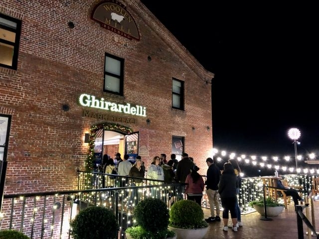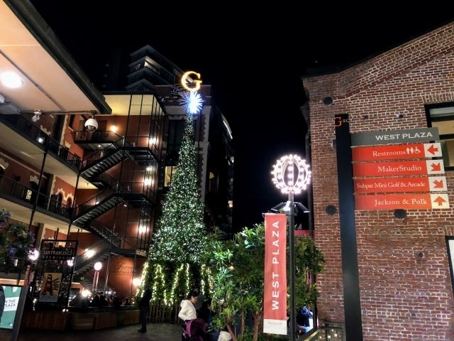 最後に紹介するのが、フィッシャーマンズワーフの最西端となる「ギラデリスクエア(Ghirardelli Square)」。ここは、チョコレート工場の跡地をマーケット広場に改装した場所で、雰囲気のあるレンガ造りの建物といたるところに施されたクリスマスイルミネーションが冬らしい雰囲気を盛りあげます。