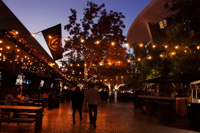 こちらは、ニューヨークニューヨークホテルとPARK MGMホテルの間にある、緑たっぷりのダイニング&エンターテイメントスポットです。ストリップからT-MOBILEアリーナまで続く遊歩道には、テラスつきのレストランが並び、木陰のベンチやテーブルでひと休みできる、まさに「公園」そのものです。