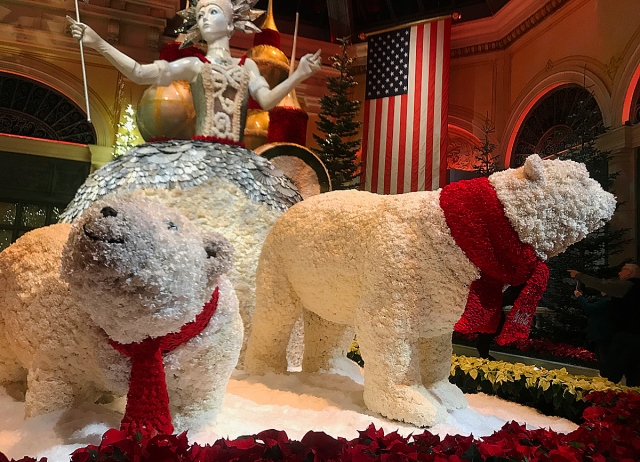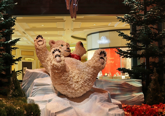 11月下旬のサンクスギビングが終わり、ホリデーシーズンに衣替えしたこの時期は、氷の王国がテーマです。白いカーネーションの花で作られたシロクマたちが愛嬌をふりまいています。