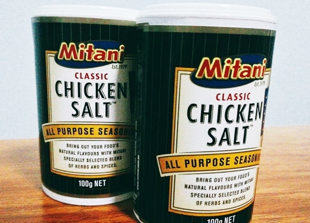 「Mitani」のチキンソルトは、南オーストラリア産。1979年に開発された代物です。もちろん、ただのソルトではないのです。チキンスープベースに海塩、タマネギ、ニンニク、パプリカなどを加え、香りに味にこだわっているチキンソルトなのです。現在では、いくつかのブランドがありますが、元祖といったらやはり「Mitani」です。