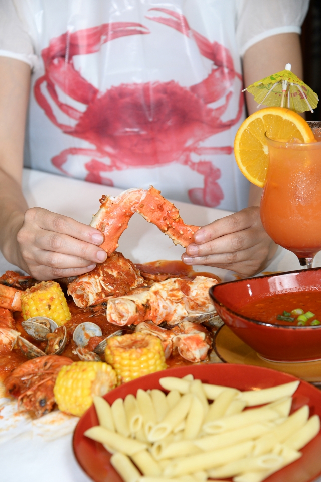 テーブルに広げられた、ダンジネスクラブ&スパナークラブ($44)やキングクラブ・レッグ($48)を、お行儀など気にしないでバキバキさばいて、お口いっぱいにほうばりましょう。カニのうまみとケイジャン・スパイスがぶわっ~と広がって、超おいしいっ☆ 海のほうを向いて「グアムありがとー!!」と叫びたくなりそうな絶品ですよ。カニさんの絵のかわいいエプロンを入れて撮影するのもお忘れなく!