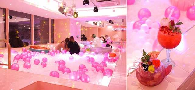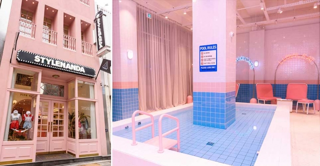 ピンクのショップといったら、人気アパレルブランドのスタイルナンダが有名。左の明洞店は1階~5階までホテルをイメージした「スタイルナンダ・ピンクホテル」。外観から内観まですべてピンク一色のインテリアは圧巻のひと言です!洋服からコスメまでフルラインが揃ったショッピングを堪能したら、表情が異なる各階の雰囲気を楽しんで。右は弘大にある姉妹店の4階にあるカフェ。水が張ってあるプールは、思わず泳げるでしょ!?とつっこんでしまうほど。提供されるスイーツやドリンクも、もちろんピンクづくしですよ。