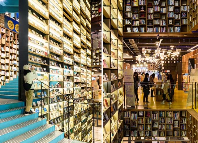 日本よりアートが身近にあるソウル。美術館はもちろんですが、公園からショップの看板まで、あらゆるものがアートに変身しています。まず紹介したいのは「ブックパーク」という、漢南洞にある大型書店。天井まで高く積みあがった本と照明のコラボレーションは美しくて大迫力。またビビッドに塗られた階段は、座って写真を撮りたくなってしまいますよ。照明には本のデザインをあしらっていたりして、細部まで作りこまれた店内は一見の価値ありです!