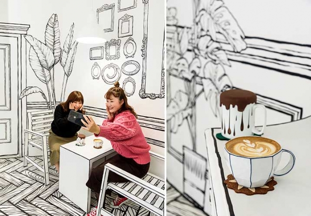 店内に入るとまるで漫画の世界に飛び込んでしまった錯覚に陥るこちらのカフェ。店内の壁にはお皿や照明などが描かれ、実在する家具にも二次元風の加工がしてあるんです。提供されるラテだって、どこまでが本物がわからなくなるくらい!不思議なイラストに囲まれてセルフィーしてみてくださいね。