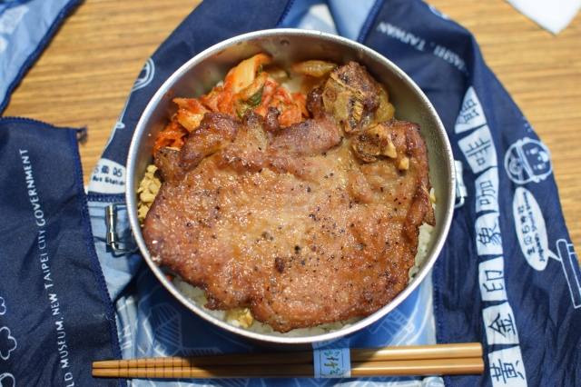 敷地内の「金瓜石鉱夫食堂」で鉱夫飯が入っている鉱夫弁当を食べました。このお弁当箱は持ち帰り可能。これももちろんTaipei Fun Passでの割引が受けられます。