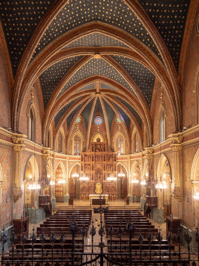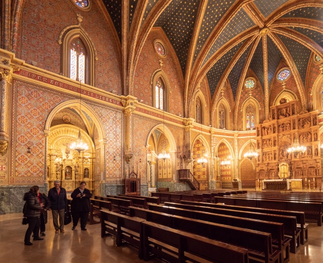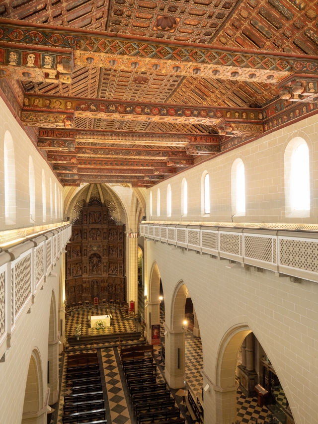 サン・ペドロ教会の本堂は荘厳です。ルネサンス様式の祭壇は16世紀の作品。その上の鮮やかなステンドグラスは、バルセロナのガウディの作品をも手がけた工房の作品です。そして、天井に輝く無数の星はすべてイスラム教を象徴する八芒星。カトリックの教会の天井にイスラムの星がきらめいているのを見て、スペイン人の芸術センスの自由闊達さは素晴らしいと感服しました。
