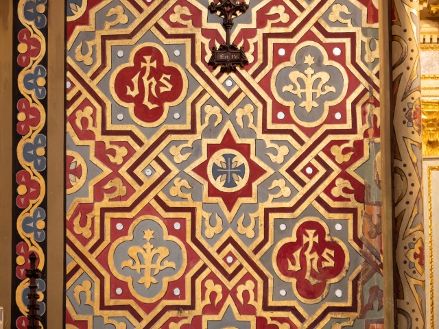 サン・ペドロ教会本堂の装飾は、18~19世紀にかけ、20年近くを要して全面的に改装されました。イスラムを象徴する八芒星のなかにキリストを象徴する十字が描かれています。