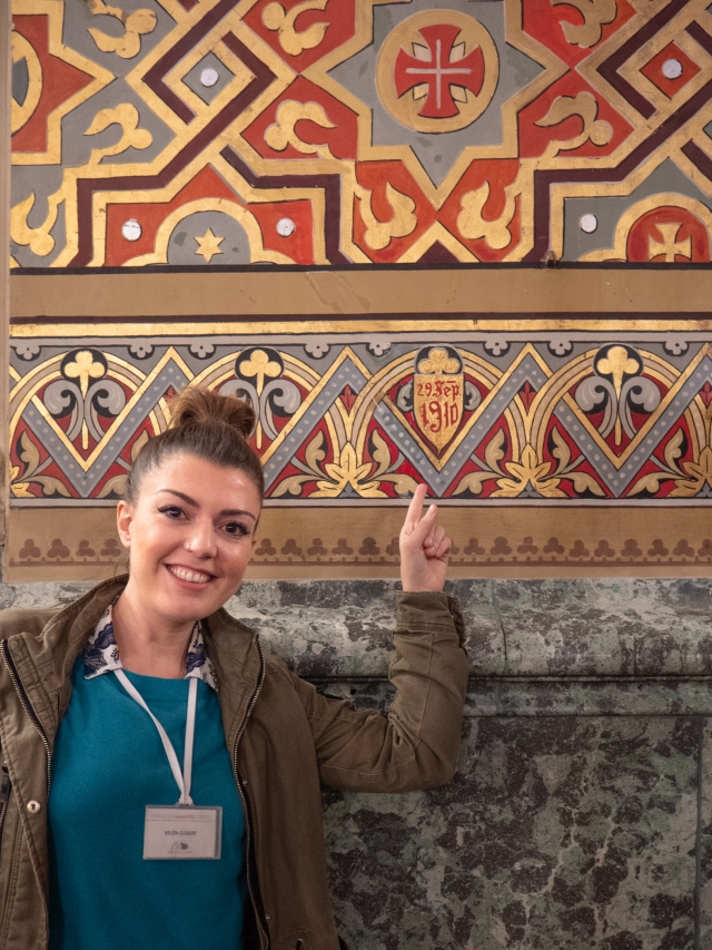 長年要した装飾作業は1910年9月29日に終了しました。責任者として地元の画家のサルバドール・ギスベルトが壁にその日付を描き残しています。その日付を嬉しそうに指さしているのは、サルバドールのひ孫のベレン・ギスベルトさん。彼女はサン・ペドロ教会の学芸員をしていて、私を案内してくださいました。