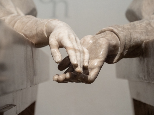 棺の彫刻をよく見ると、愛し合うふたりの手が重なっているように見えますが、実はほんの少しだけ離れています。現世で成就できなかったふたりの愛が表現されていて、せつなく感じます。