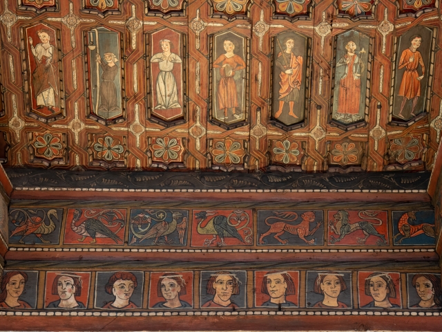 大聖堂で特に目を引くのは、天井装飾に描かれた様々な人物画です。昔は、人物画とは王侯貴族や貴婦人を描くものとされ、庶民を描くという発想はまったくありませんでした。しかしここの天井に描かれているのは、大聖堂を建築中の職人や、おかみさん、イスラム教徒など、当時の常識では考えられない「普通の人々」の姿が描かれています。白いハチマキを巻いているのがイスラム教徒です。美術的に色彩が豊かで楽しめるだけでなく、民俗学的にもたいへん興味深い天井装飾です。