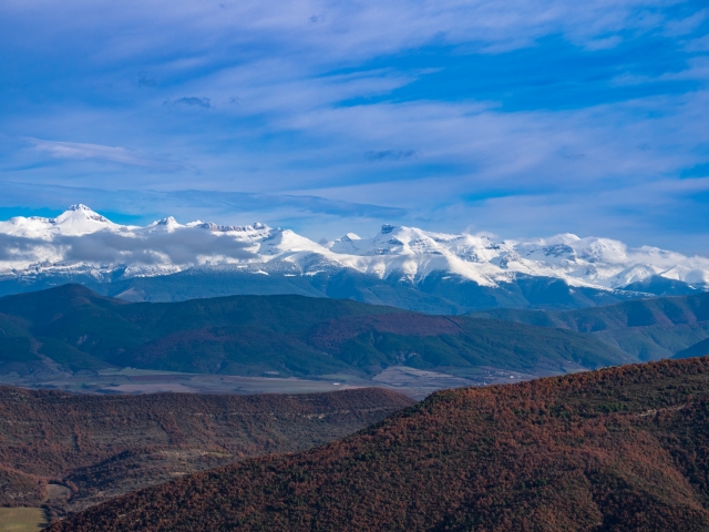 アラゴン州の北には東西430kmに渡る大山脈、ピレネー山脈が聳えています。銀嶺の向こうには氷河があり、フランスとの自然の国境となっています。8~12世紀のイスラム時代にも、山が多いアラゴン北部にまでは、モーロ人の統治は及びませんでした。そのためモーロ人統治下にあったアラゴン州南部とは、建物の雰囲気がずいぶん違い、教会もムデハル調ではなくロマネスク様式で建設されています。今日は、ピレネーの麓へロマネスク美術を堪能しにやってきました。