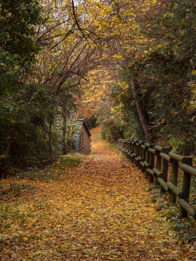 サラゴサに遷都するまでアラゴン王国の都だったハカから車で20分、ピレネー山脈を左に見ながら丘陵の道を登ると、紅葉のトンネルの向こうにサン・フアン・デ・ラ・ペーニャ修道院 Real Monasterio de San Juan de la Peñaが見えてきます。落葉で埋まったこの道はサンティアゴ巡礼路でもあり、北はフランスへ、そして西は約800km先の聖都サンティアゴ・デ・コンポステーラへと続いています。