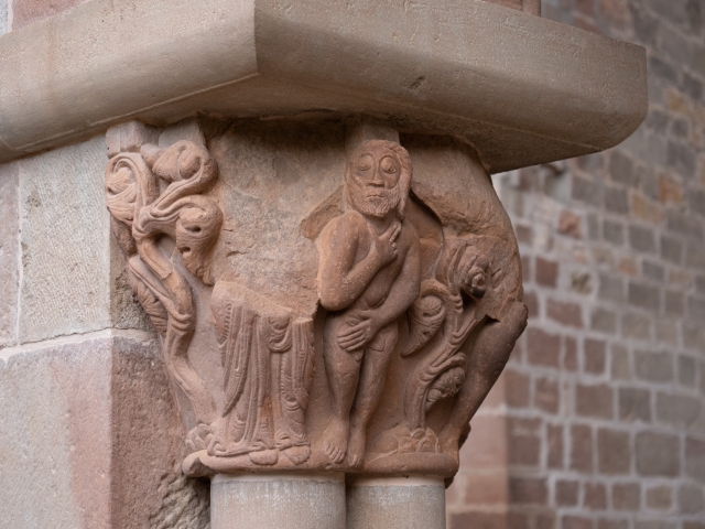 こちらは「聖ヨセフの夢」。寝ているヨセフのもとに天使が現われて「あなたの妻のマリアが男の子を産みます。その子をイエスと名付けなさい」と語りかけているシーンです。天使の身体が虫のような形をしている、ロマネスクらしい不思議な彫刻です。ロマネスク美術がこのように素朴でひょうきんに見えるのは、中世ヨーロッパの造型技術力が未熟で、美術的に言えばデッサン力がなかったためだといわれています。そのため、かえってダイナミックなデフォルメがなされ、ルネッサンス以降の西洋美術にはないプリミティブな美しさが感じられます。