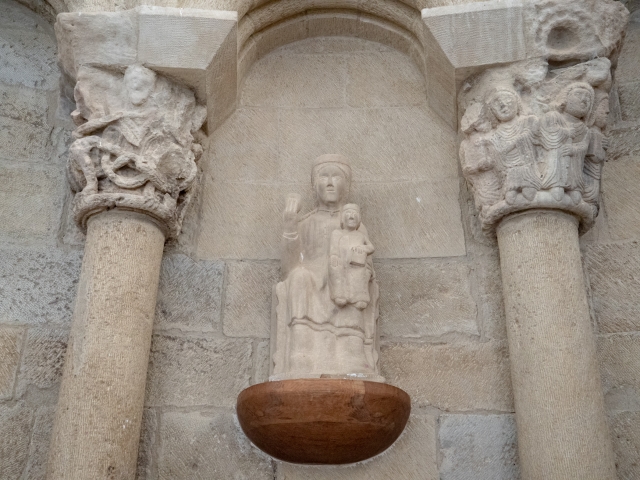 幼子のイエスを抱く聖母マリア。ロマネスク時代はまだマリア信仰が確立していなかったので、マリアの存在はそれほど重視されておらず、ここではイエスの椅子の役を果たすだけのシンプルな姿をしています。ロマネスク以降になると、マリアはもっとイキイキとした写実的な姿をして息子のイエスを見つめていて、息子もまた母を見つめるようになります。