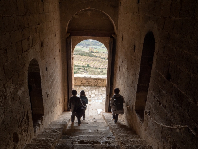 次の目的地は、 ペーニャ修道院から南へ40kmほど離れた丘陵の南端に建つロアレ城。ここでピレネー山脈が終わり、この先は平原が広がります。ロアレ城は、サンチョ大王が、数km先にあるボレアというイスラム教徒の町を攻略するために建てた城です。現在見られる姿は、サンチョ1世(サンチョ大王の孫)の時代に増改築されたものです。11世紀のロマネスク建築としてはヨーロッパで最も保存状態のよい城として、しばしば映画のロケ地にも使われています。
