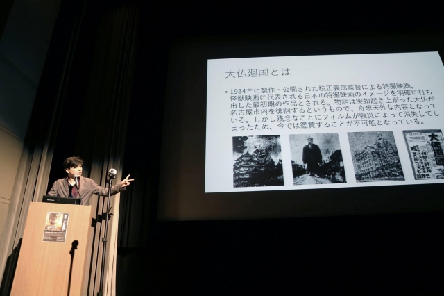 戦前1934(昭和9)年に作られた『大佛廻國・中京篇』という映画があります。日本の特撮黎明期の作品で、諸人の祈願に感応して立ち上がった愛知県の聚楽園大仏が、名古屋および名古屋近郊の観光地を巡るという物語です。戦時中および戦後に映画のフィルムは失われ、現在では当時の新聞や雑誌などからしか作品の断片を知ることができません。この同作のコンセプトを現代に蘇らせ、新たなアレンジを加えて2018年12月に完成した映画『大仏廻国 The Great Buddha Arrival(監督:横川寛人)』の関係者を招いての上映会が、東京都台場にあるフジテレビのマルチシアターで開かれました。