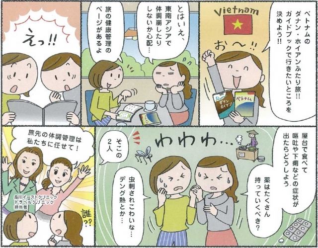 旅先が冒頭のマンガのようにベトナムなら、屋台でフォーを満喫したいけれど、衛生面が少し心配なので下痢止めや腹痛薬を持って旅立てばより安心です。さらに出発前にワクチンを接種して、水などからのA型肝炎ウイルスの感染を予防しましょう。