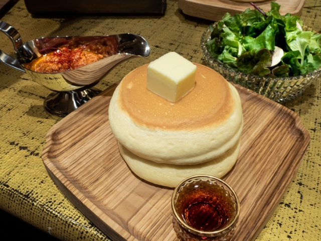 一方、食事系「北海道ほっとけーき ボロネーゼ」(1,900円)は、北海道産豚肉を使用。無添加のボロネーゼソースが、「北海道ほっとけーき」の生地によく合い、満足感たっぷりです。サラダとテイストチェンジ用の自家製シロップもうれしい一品です。