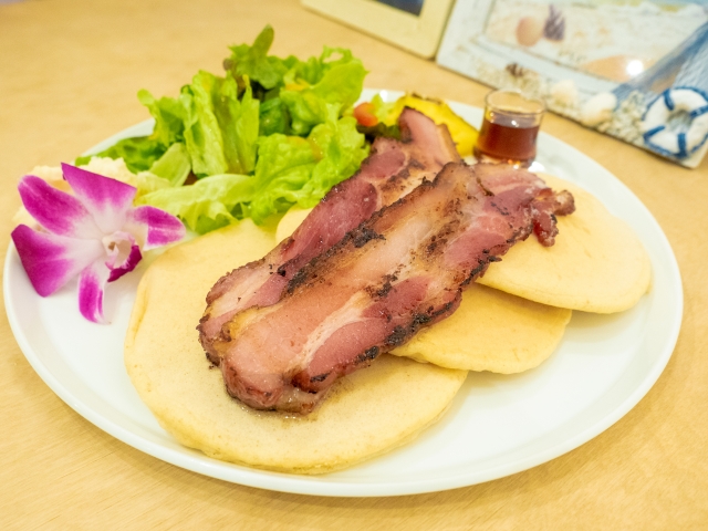 上の写真の「ベーコン添えパンケーキプレート」(1,580円)は、パンケーキ専用粉と長期氷温熟成ベーコンを使った食事系パンケーキです。もっちりした食感のパンケーキと存在感あるベーコンにもかかわらず、意外にさっぱりと食べられ、ランチにおすすめです。