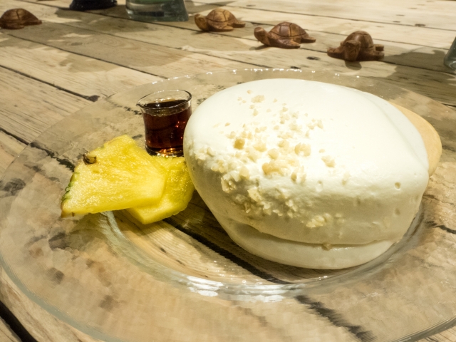 スイーツ系のひとつ、「プレーンパンケーキ」(1,180円)は、クリームが絶品。甘すぎず、さわやかな口当たりのマンゴーフレーバークリームのパンケーキに、添えてあるメープルシロップをかけて、違ったテイストを味わいながらいただくのがおすすめです。