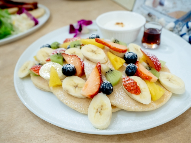 ハワイを思わせる「フルーツ添えパンケーキプレート」(1,580円)は、とてもフォトジェニック。ちりばめられたフルーツの味を楽しみながら、別腹でさっぱりしたパンケーキを味わえます。