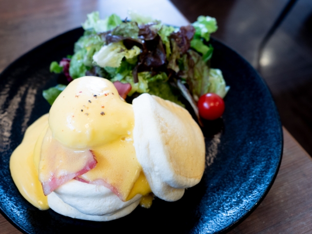 食事系パンケーキ「エッグベネディクト」(1,300円)には、サラダがついて、こちらもボリュームたっぷり。各テーブルにメープルシロップが置いてあり、食事系パンケーキでもたっぷりのメープルシロップでテイストチェンジできます。