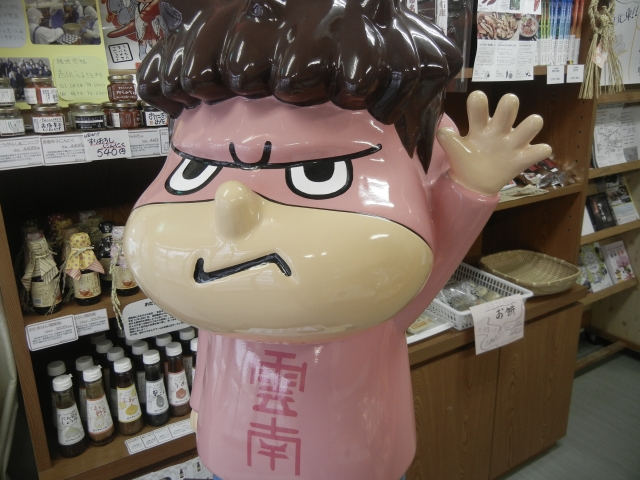 最後に「稲わら工房」にも立ち寄っていきましょう。入口では、フラッシュアニメ『秘密結社鷹の爪』のキャラクター「吉田くん」が出迎えてくれます。「吉田くん」のふるさとは「よしだむら」で、「吉田くん」は雲南市の特別住民票も持っているそう。稲わら工房では、「吉田くん」グッズを豊富に取り揃えています。また、元祖たまごかけごはん専用醤油「おたまはん」は、稲わら工房限定バージョンがあります。